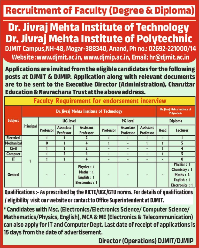Dr.jivraj Mehta Institute of Polytechnic Mogar-Anand managed by Charuttar Education and Navrachana Trust has started spreading its wings in the engineering field. DJMIP welcomes you and look forward to your valuable association with us for bright future. DJMIP has emerged as one of the most preferred institutes in Engineering and Technology. DJMIP is having an aesthetically designed campus spreading over approximately 11 acres of clean and green environment at Mogar.